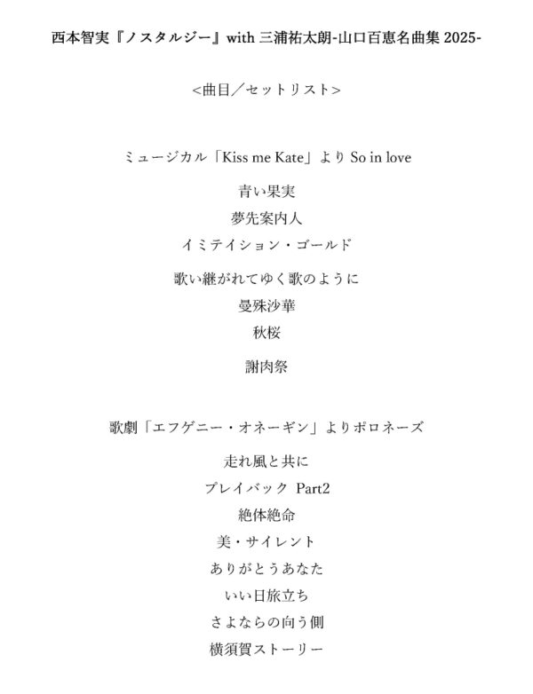 【セットリスト決定!!】西本智美『ノスタルジー』with 三浦祐太朗 -山口百恵名曲集 2025-